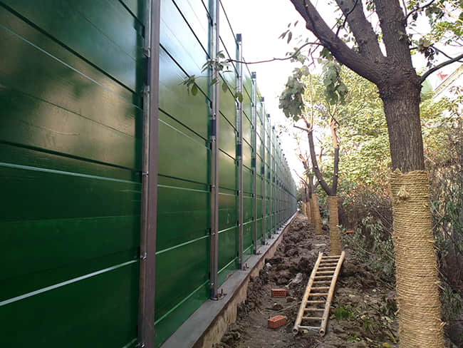 3、 隔聲屏障屏體??紤]到降噪工程的使用壽命,我們采用75mm厚金屬吸隔聲屏體作為降噪結(jié)構(gòu),平均吸聲系數(shù)在0.80以,屏體內(nèi)部用多層憎水玻璃棉與纖維布結(jié)構(gòu)。