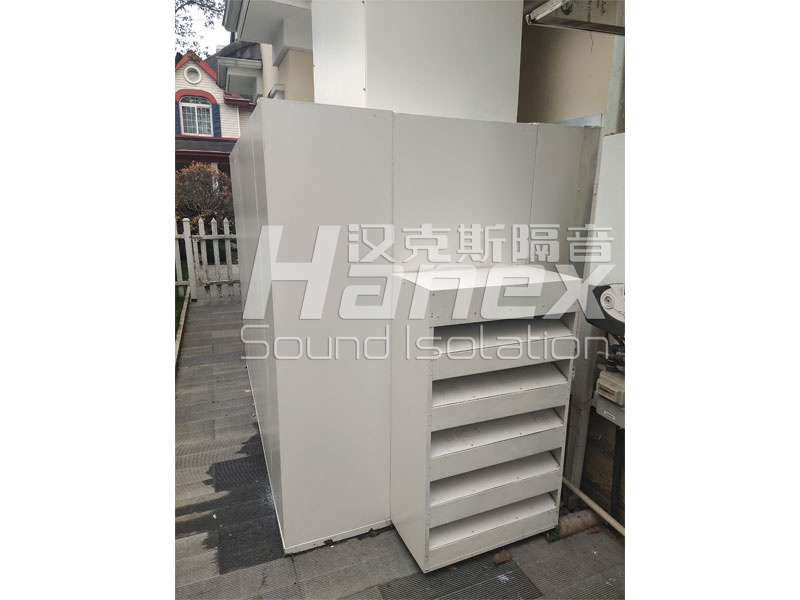 隔聲罩左方安裝設(shè)備檢修門,方便人員進(jìn)出,右側(cè)安裝一臺通風(fēng)消聲器,保證設(shè)備通風(fēng)散熱的正常。頂部安裝一臺排風(fēng)消聲器。隔聲罩背面靠墻處安裝吸聲層。