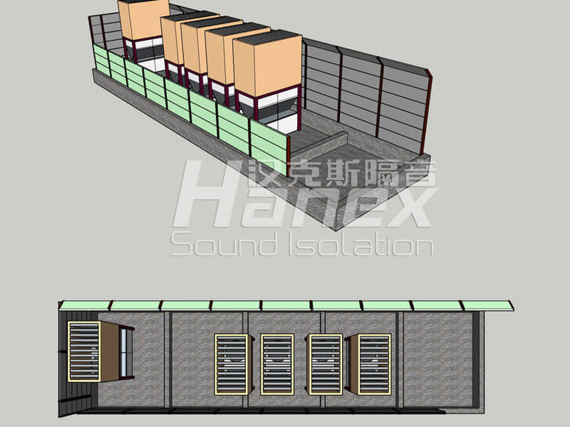 安裝出風消聲器后,設備出風口噪聲大幅度的降低,為進一步提高降噪效果,同時保障設備正常運行,在設備的北面與西面安裝高3.5米的吸隔聲屏障。設備的南面安裝高1.5米的聲屏障。屏障采用H型鋼立柱,安裝在女兒墻上。
