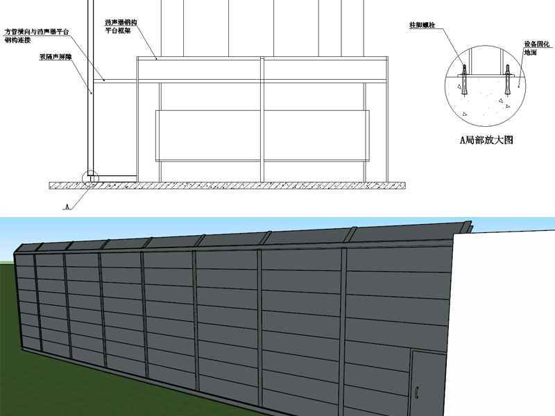 5、吸隔聲屏障立柱采用HW125型鋼,底部找平基礎(chǔ)采用HW150型鋼,立柱底部與型鋼基礎(chǔ)進(jìn)行焊接,立柱間距2.5米,型鋼基礎(chǔ)底部預(yù)埋螺栓與設(shè)備固化地面進(jìn)行連接,底部與設(shè)備基礎(chǔ)進(jìn)行橫向連接,同時(shí)為增加其抗風(fēng)性能,吸隔聲屏障中部與排風(fēng)消聲器平臺(tái)進(jìn)行橫向連接。