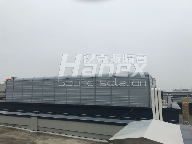 4臺(tái)風(fēng)冷熱泵機(jī)組壓縮機(jī)噪聲為本項(xiàng)目重點(diǎn)噪聲源,線(xiàn)針對(duì)壓縮機(jī)的嗡嗡低頻聲,光外圍一層屏障遮擋效果有限。設(shè)計(jì)對(duì)壓縮機(jī)部分進(jìn)行二次處理,對(duì)壓縮機(jī)加裝一個(gè)5面包圍小型隔聲罩。隔音罩對(duì)地面一側(cè)開(kāi)口,留作壓縮機(jī)通風(fēng)散熱,其余5面都由復(fù)合鋼制吸隔聲板制成。
